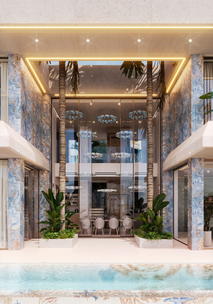 The entrance sets the tone before you’ve even stepped inside. A sculptural pivot door opens into a hall where large-format Versace Ceramics slabs cover the floor, edged with a hand-cut Versace mosaic border. The walls carry the marble through to the first door frames, which are also clad in Versace stone. Water features run along the edges. Natural light falls through the double-height space.