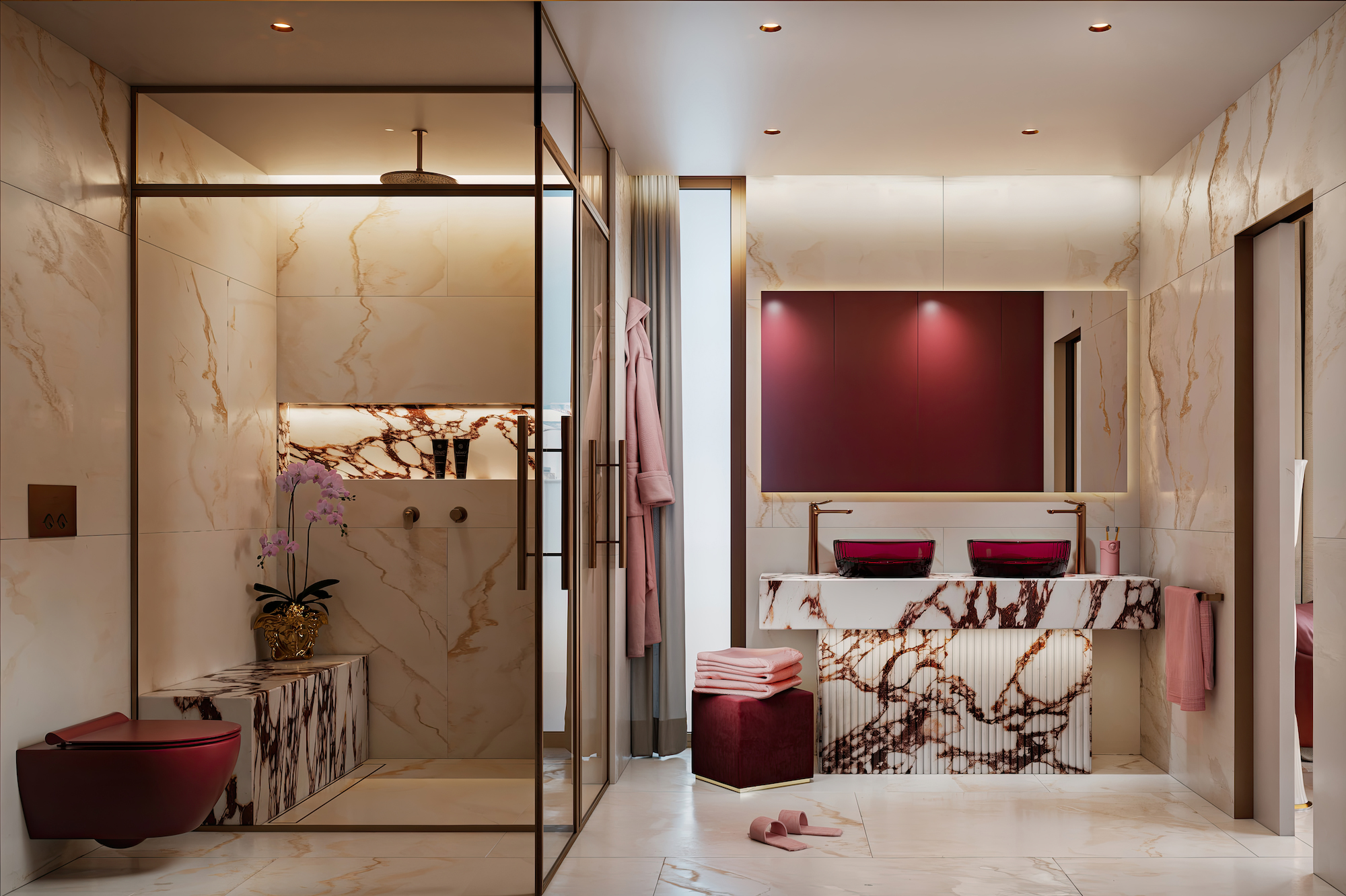 The bathroom here is about contrast. Calacatta Viola tiles on the shower walls and vanity surfaces meet two deep ruby-red Versace ceramic basins on a sculptural fluted counter. The toilet is finished in burgundy ceramic. The taps and towel rail are rose gold, Versace. The Versace Greca mirror runs above the vanity, is backlit, and, in the evening, turns the whole room amber.
